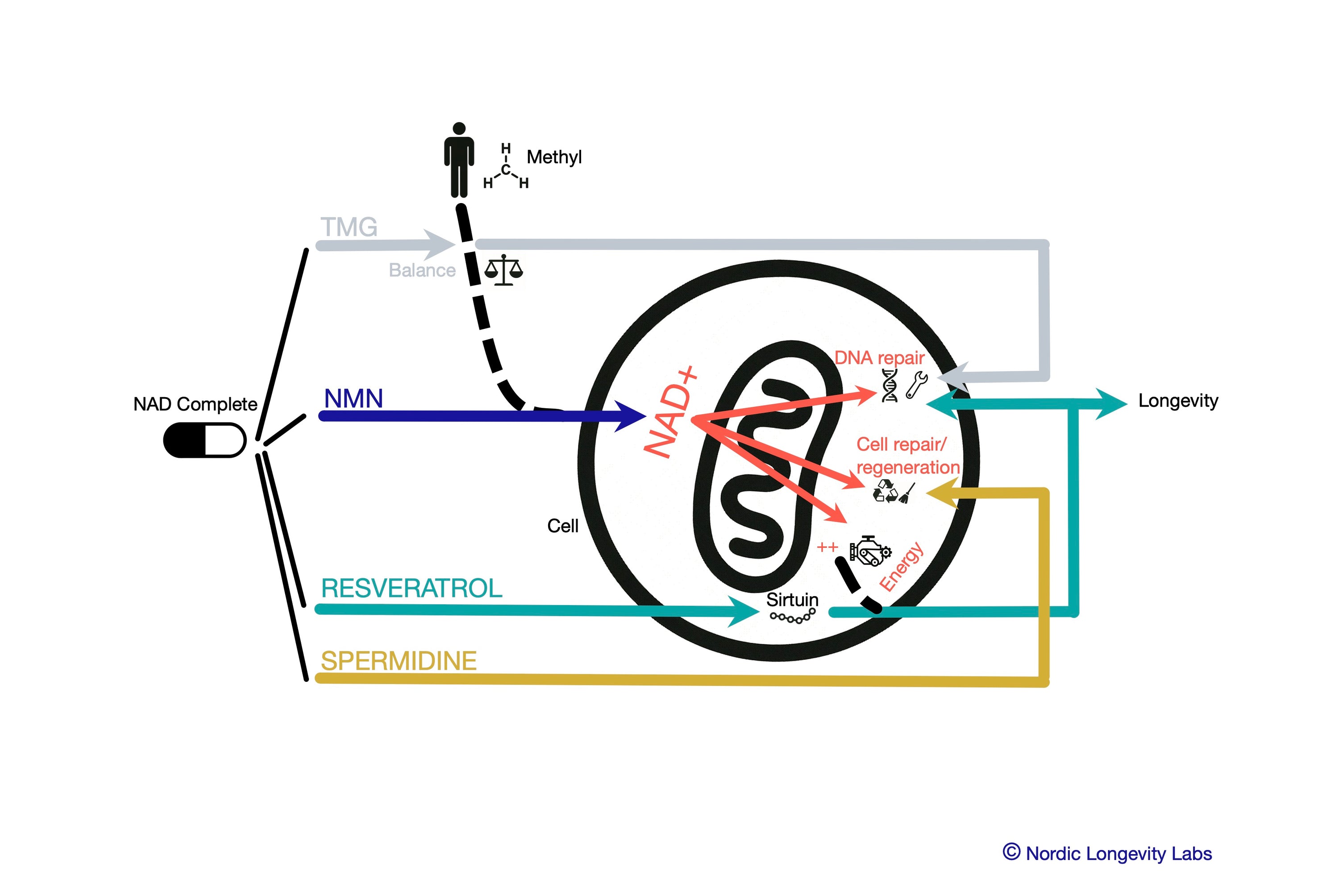 NAD+ nivåene stabiliseres ytterligere. Samspillet mellom NMN, TMG, resveratrol og spermidin gir bredere cellulær støtte. Du kan oppleve bedre restitusjon, økt vitalitet og støtte til kroppens naturlige balanse.